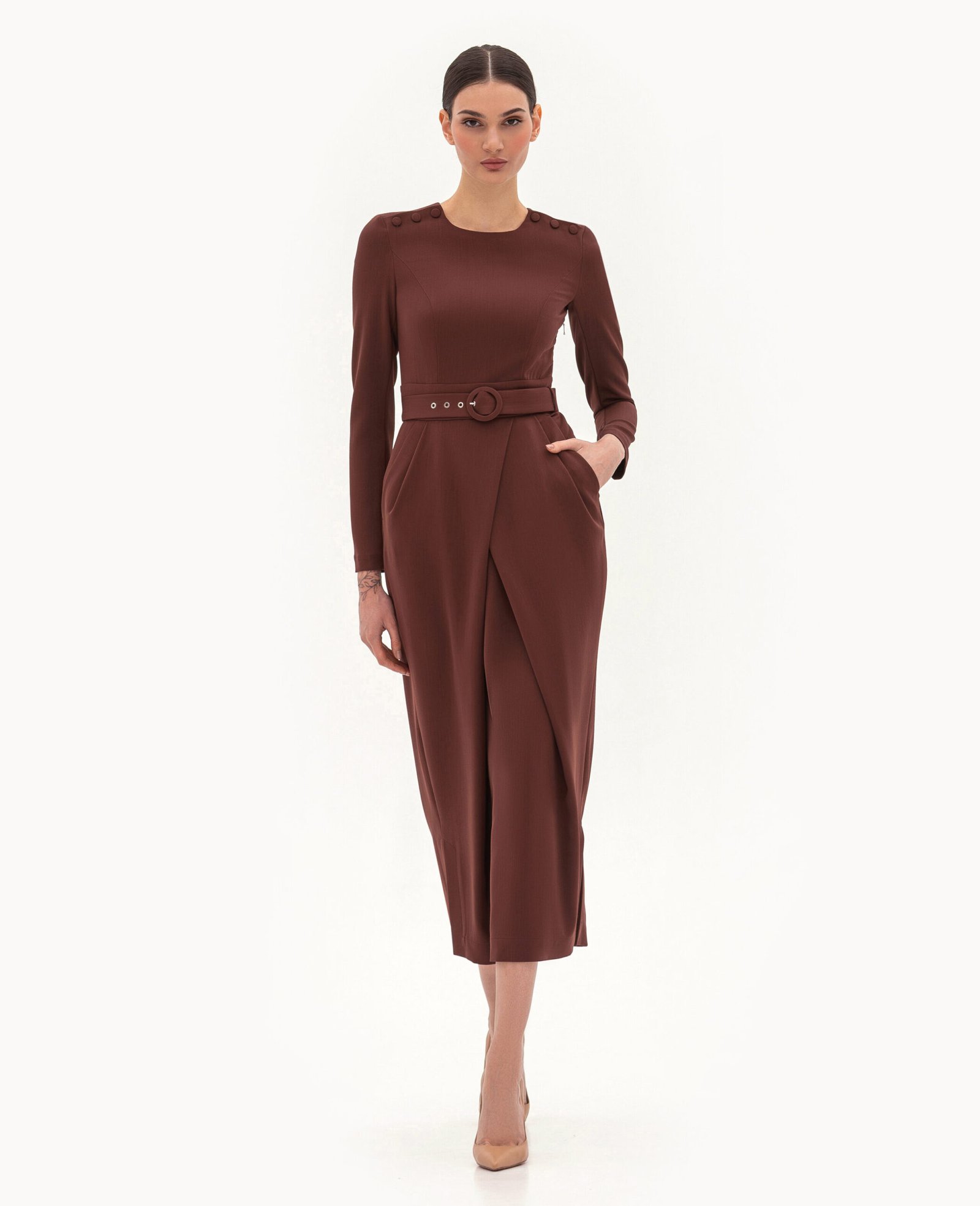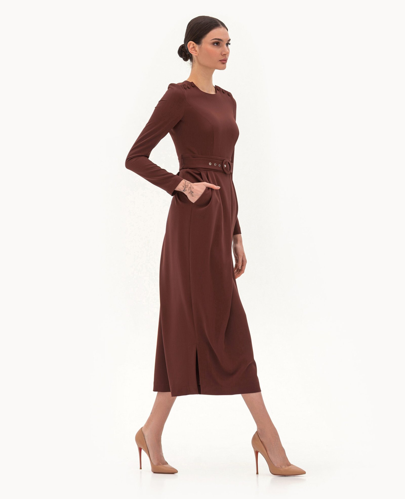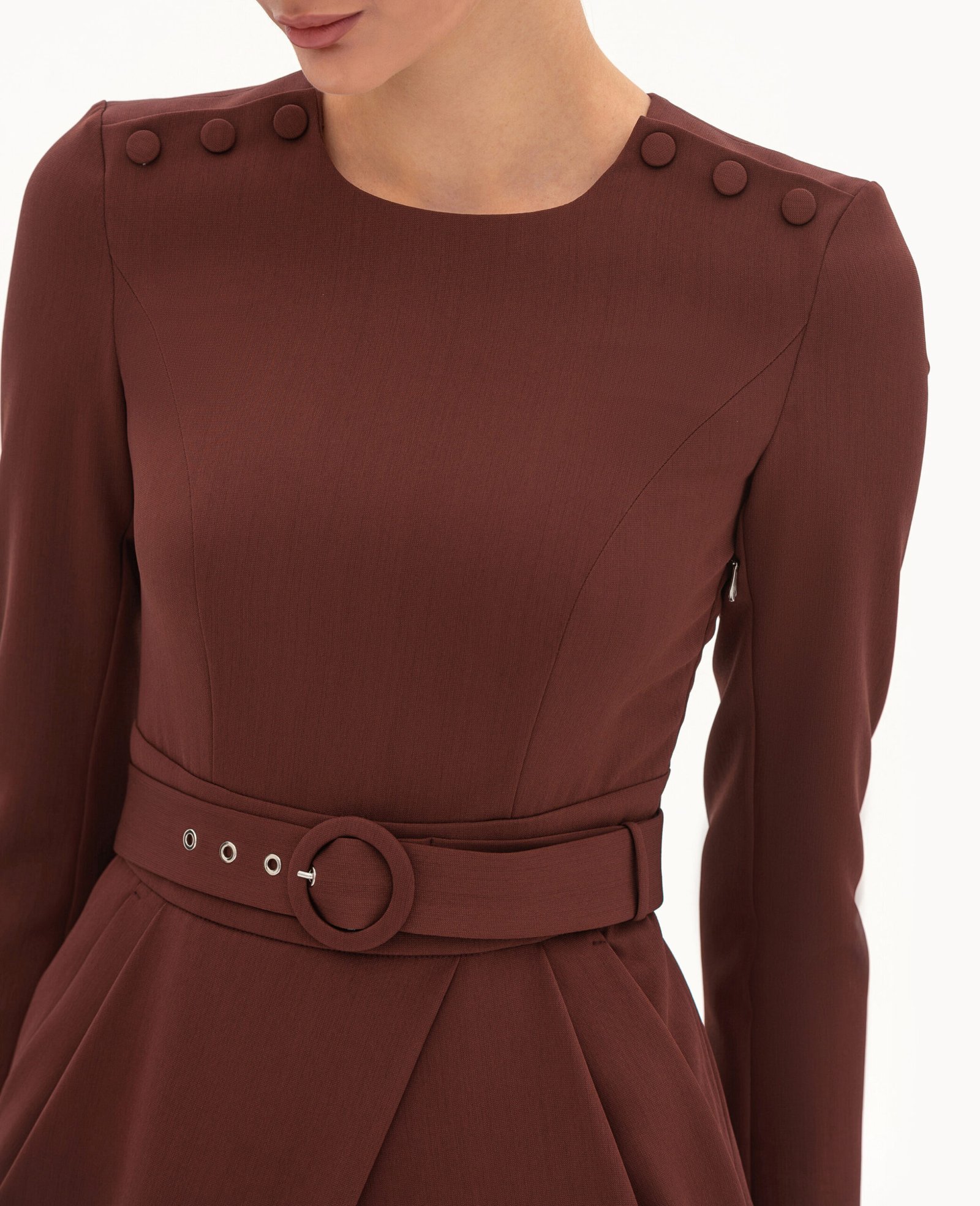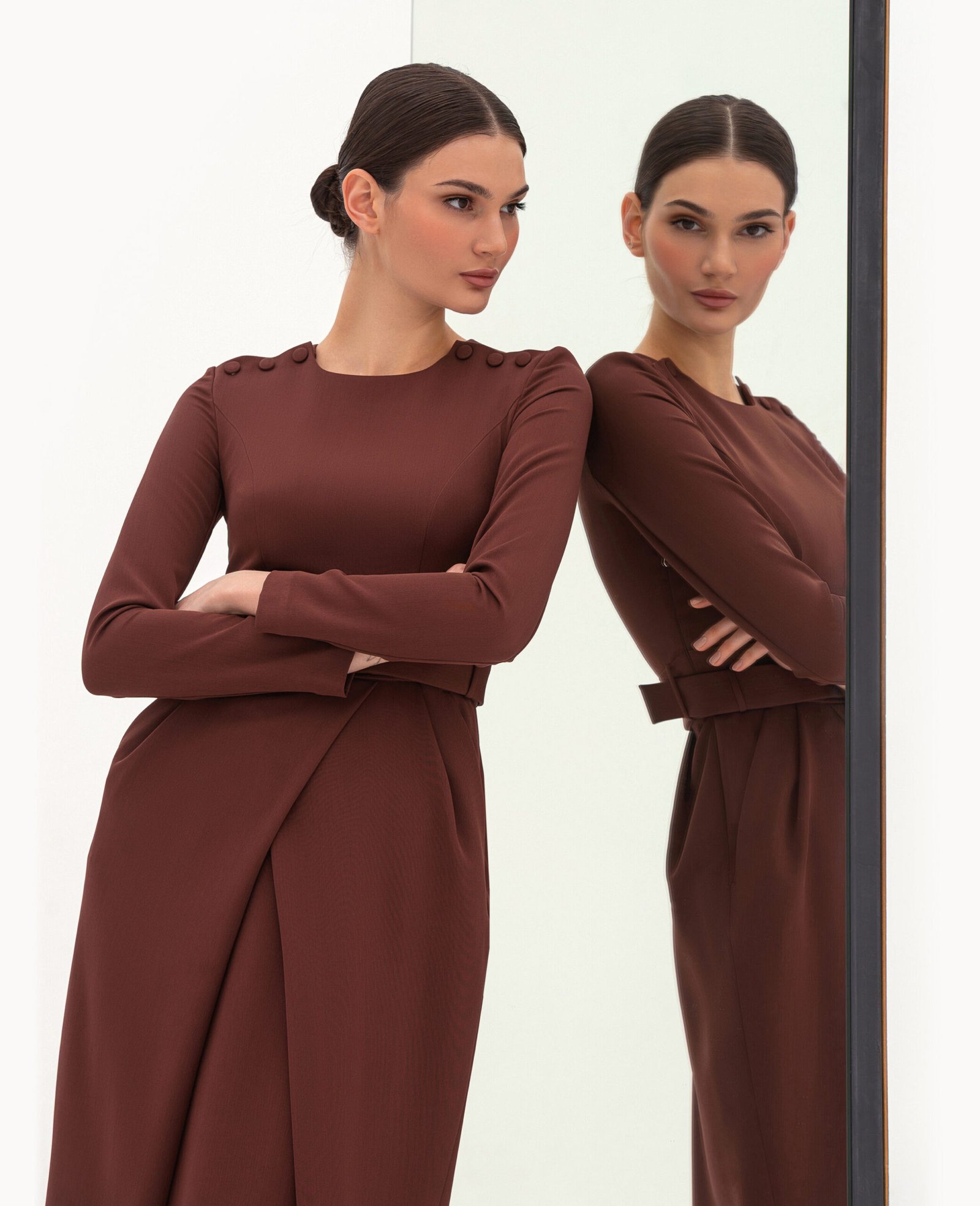 Вид виробу: сукня з виділеною лінією талії, глибокими складами по спідниці, розрізами з бокових швів і декоративними кнопками по плечовій лінії.