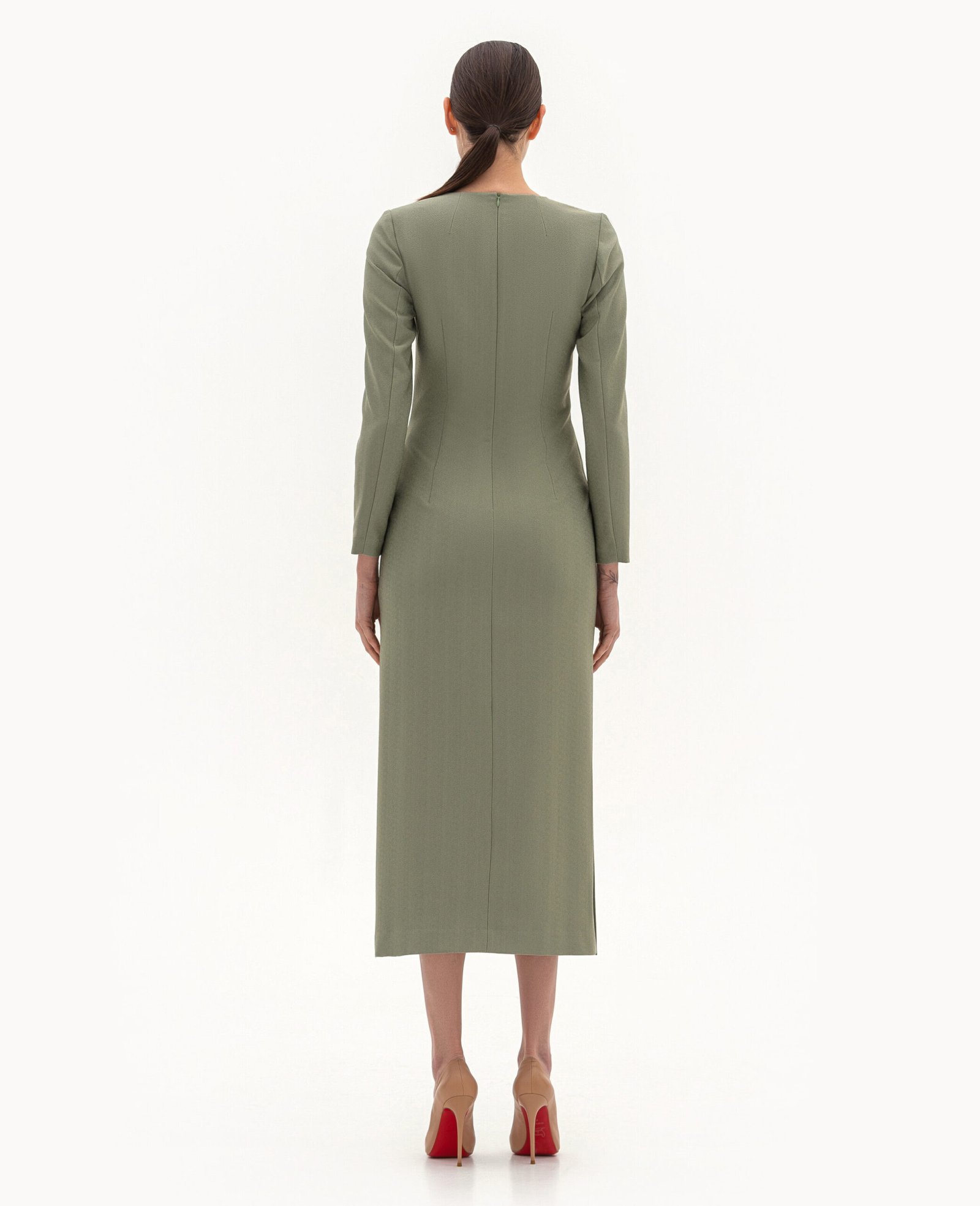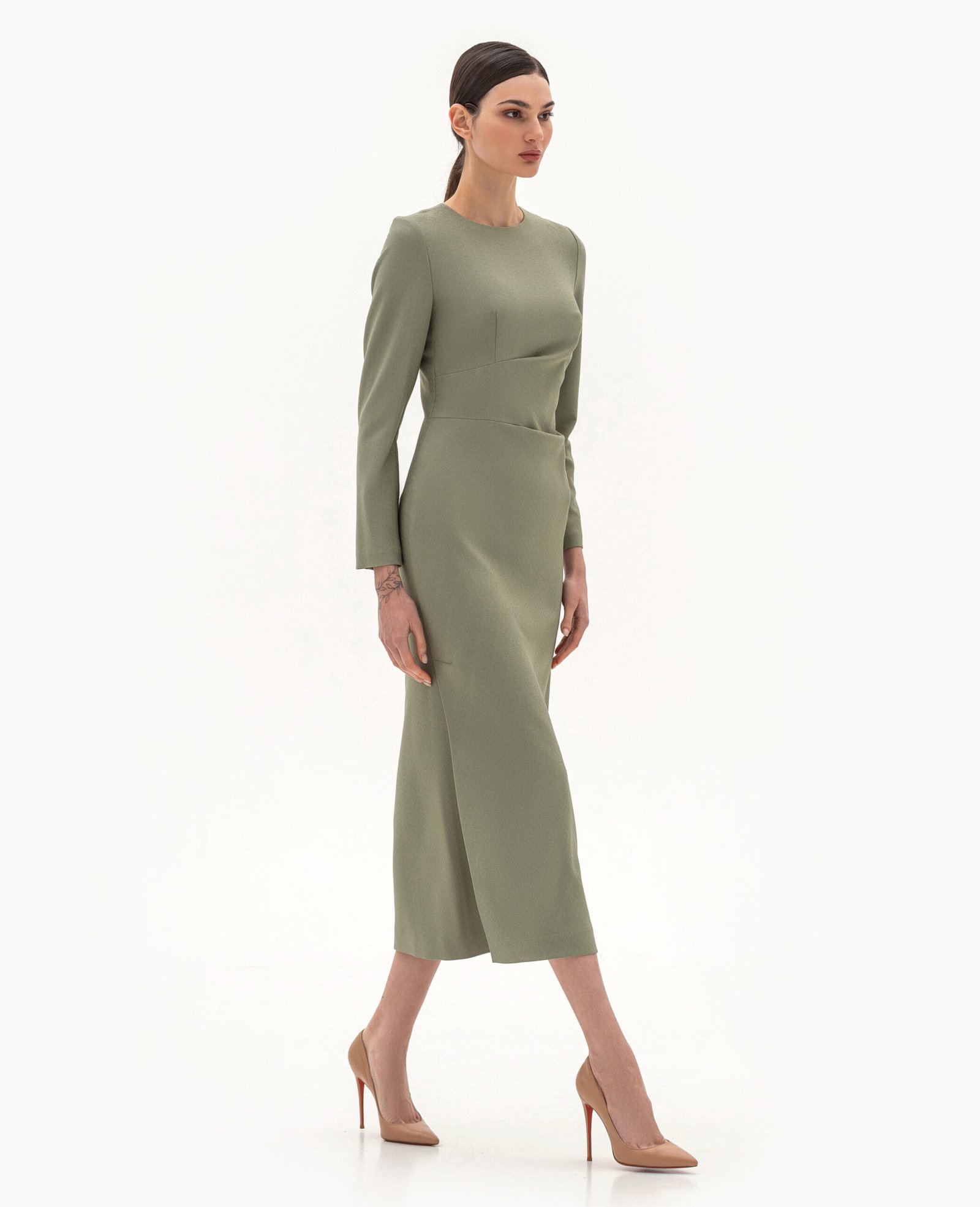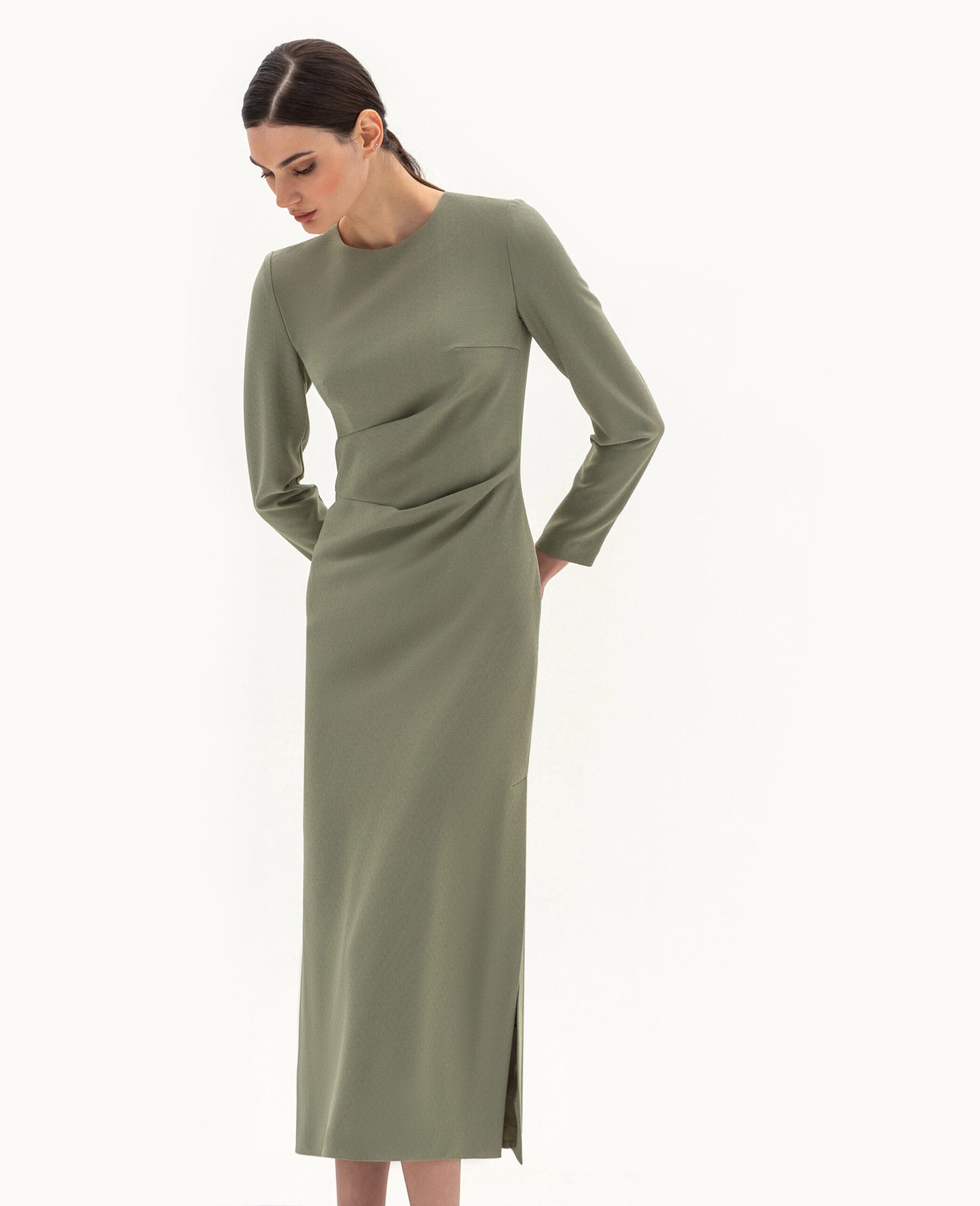 Вигляд виробу: пряма сукня з декоративними складками, що драпіруються, в області талії та грудей, з двома бічними шліцями.
