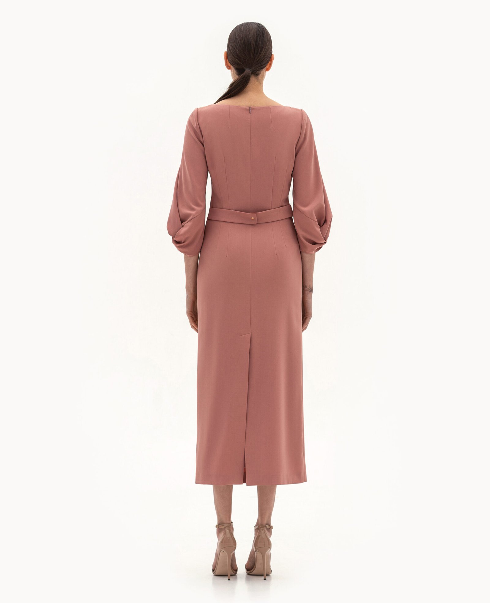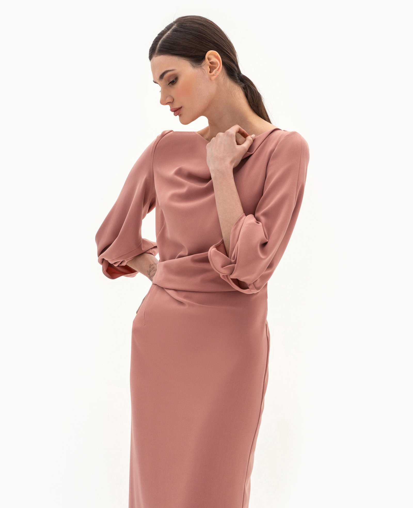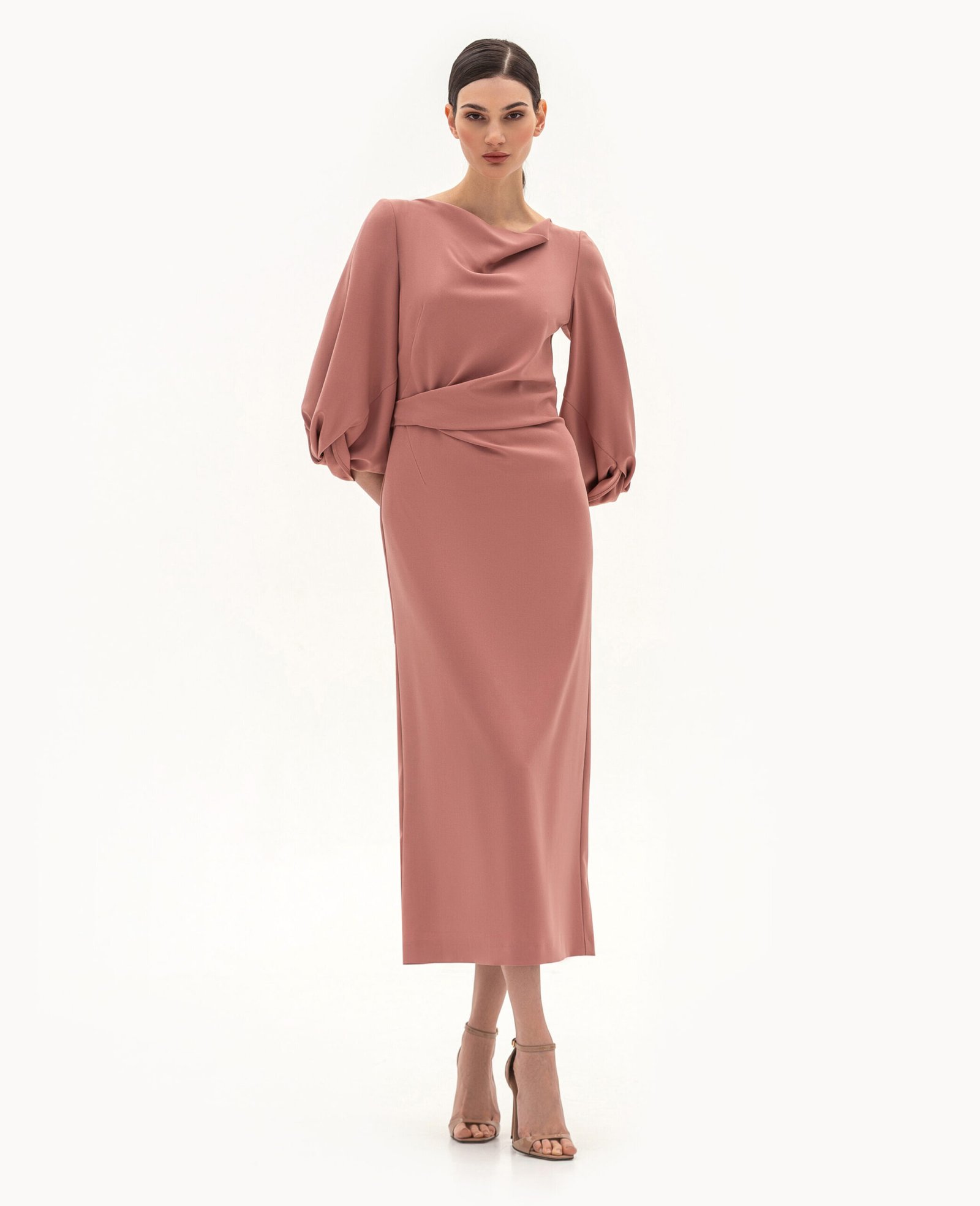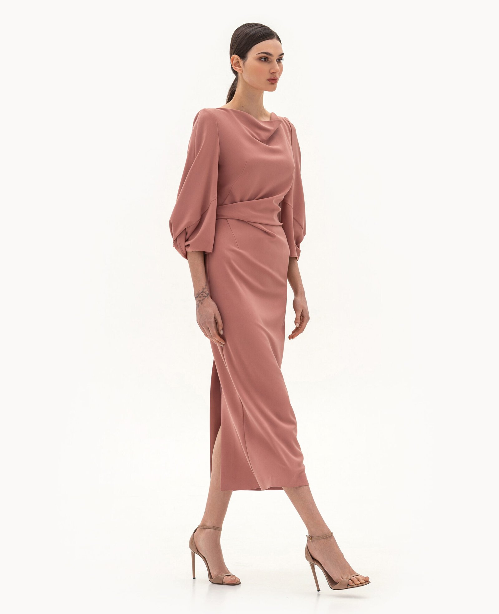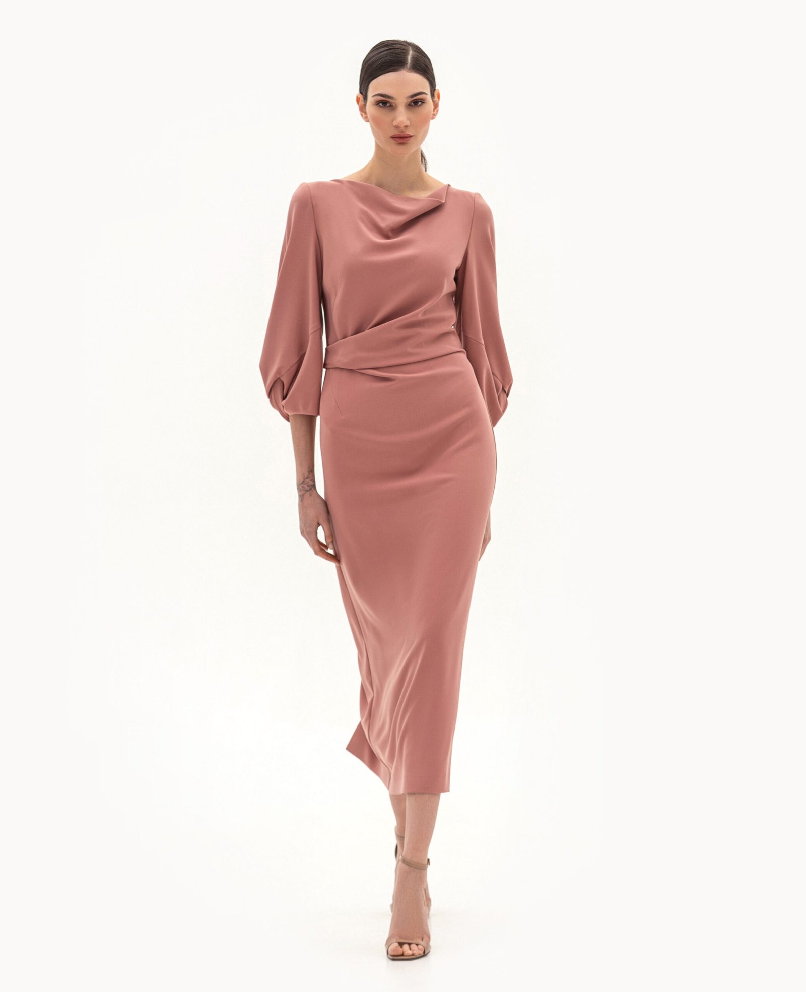 Вид виробу: пряма сукня з складками, що драпіруються, по лінії талії, м'якою лінією горловини, і, рукавами з акцентними деталями.