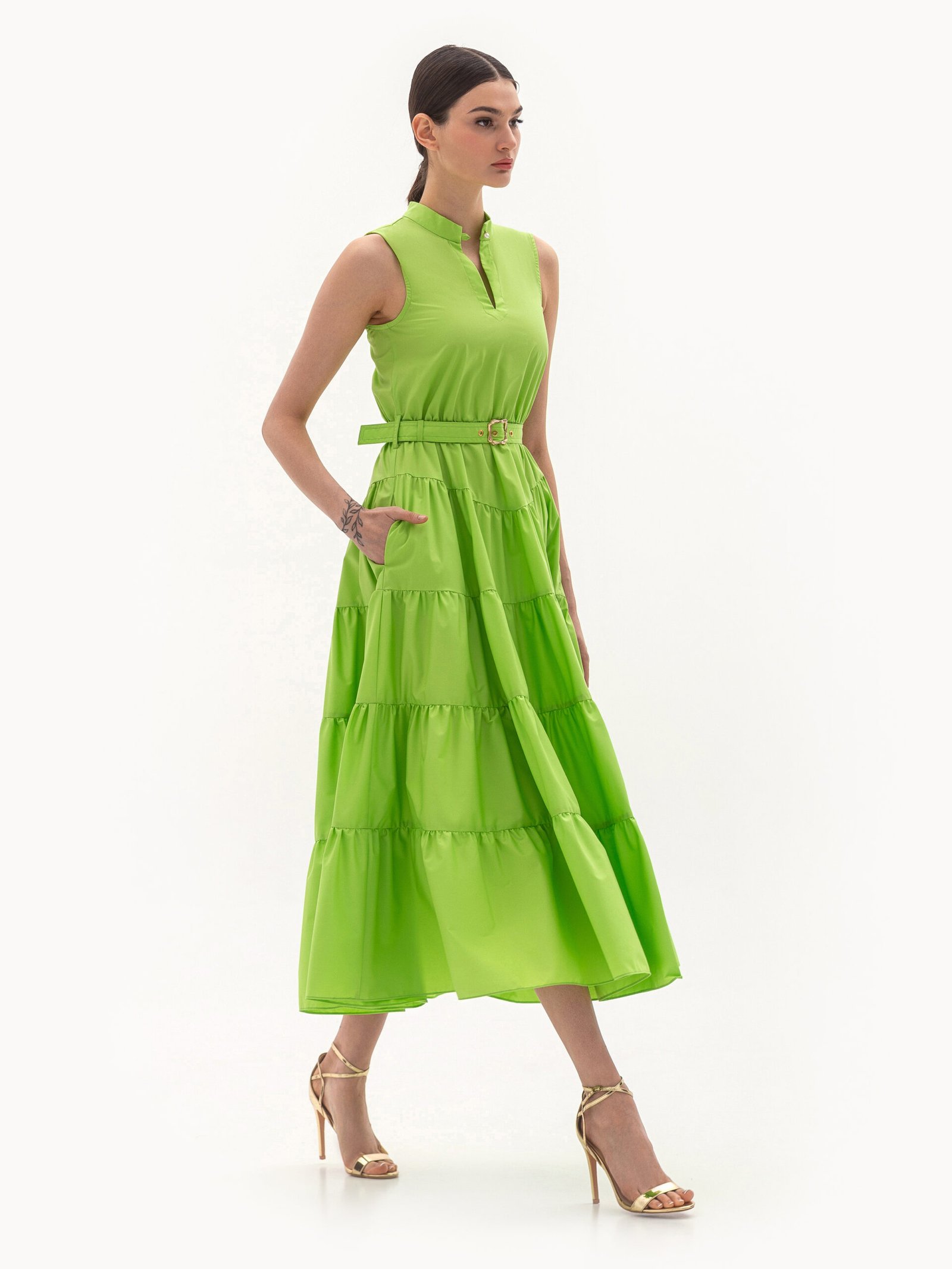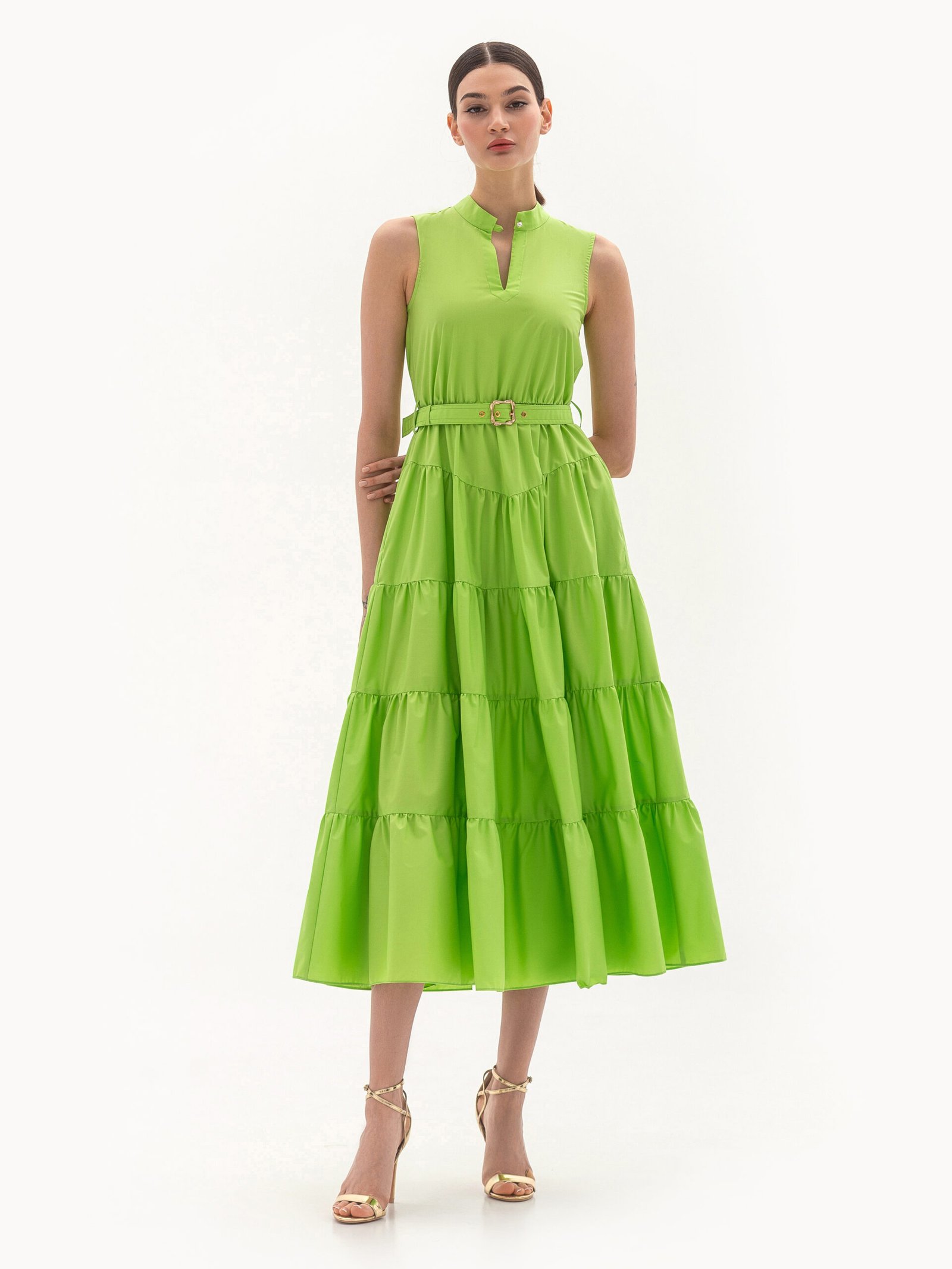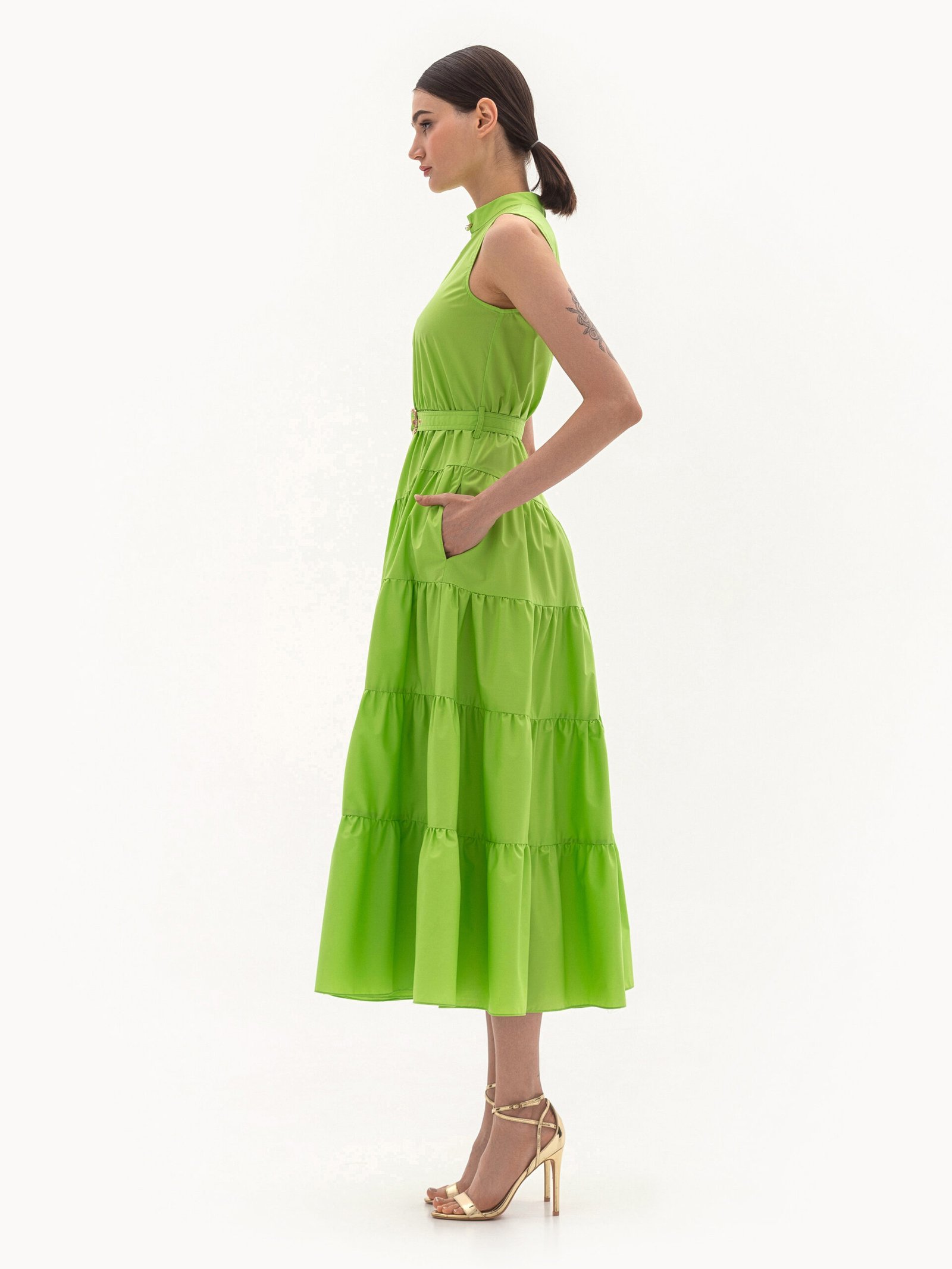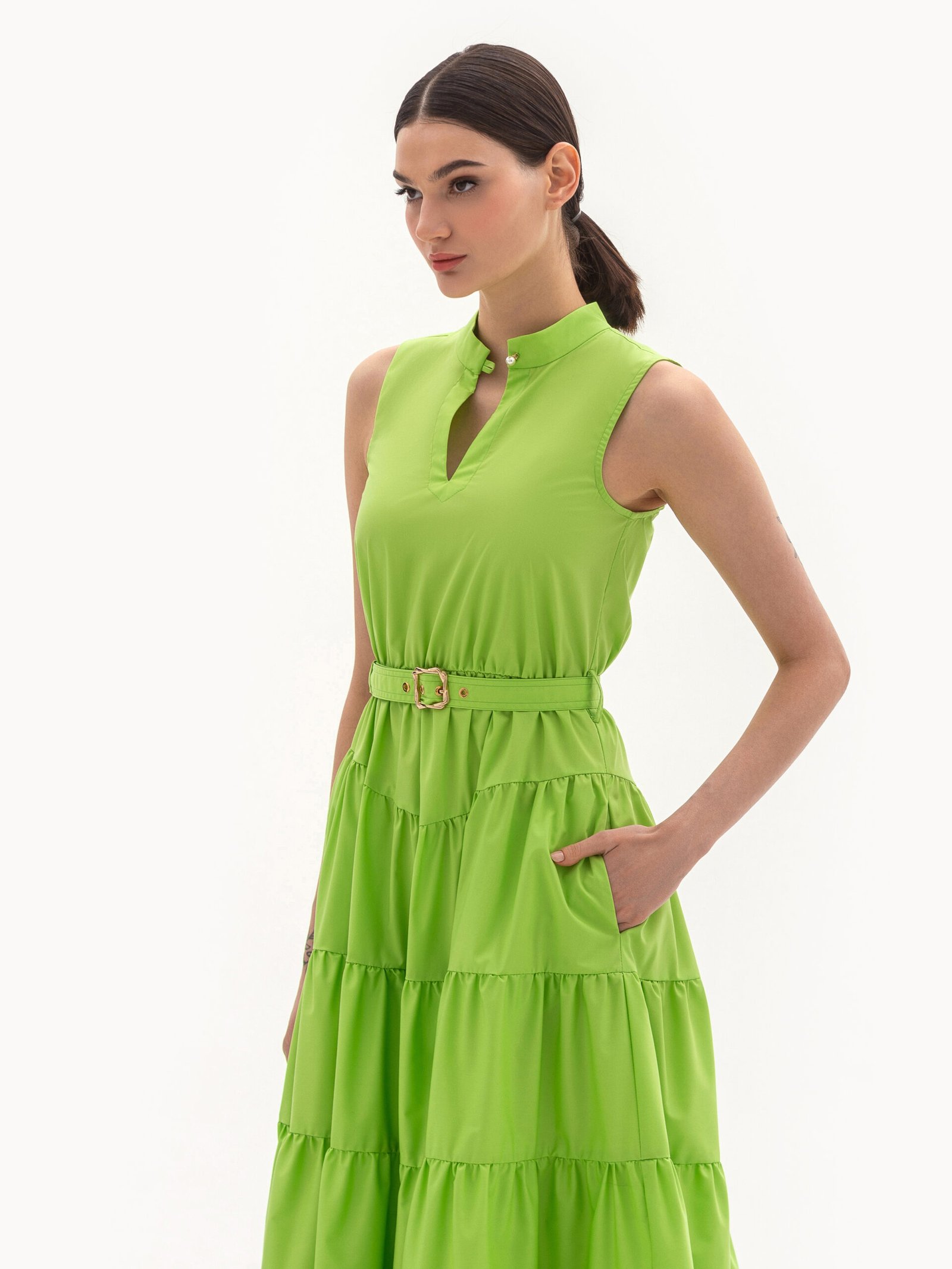 Вид виробу: розкльошена ярусна сукня з виділеною лінією талії, відкритою проймою, коміром-стійкою та розрізом по горловині.