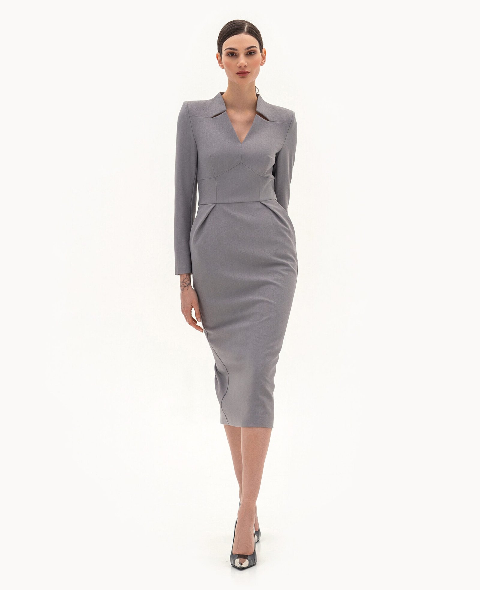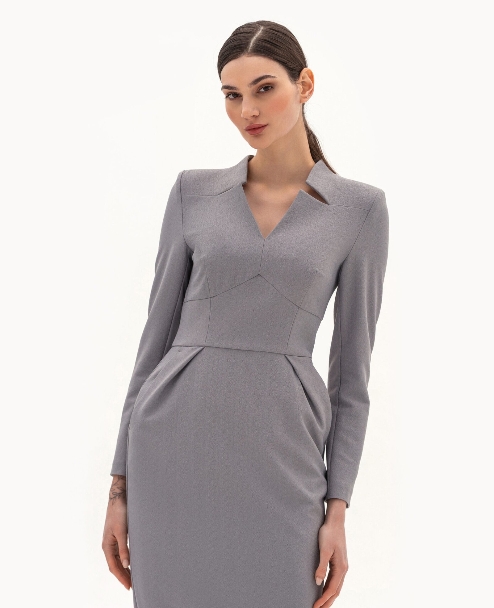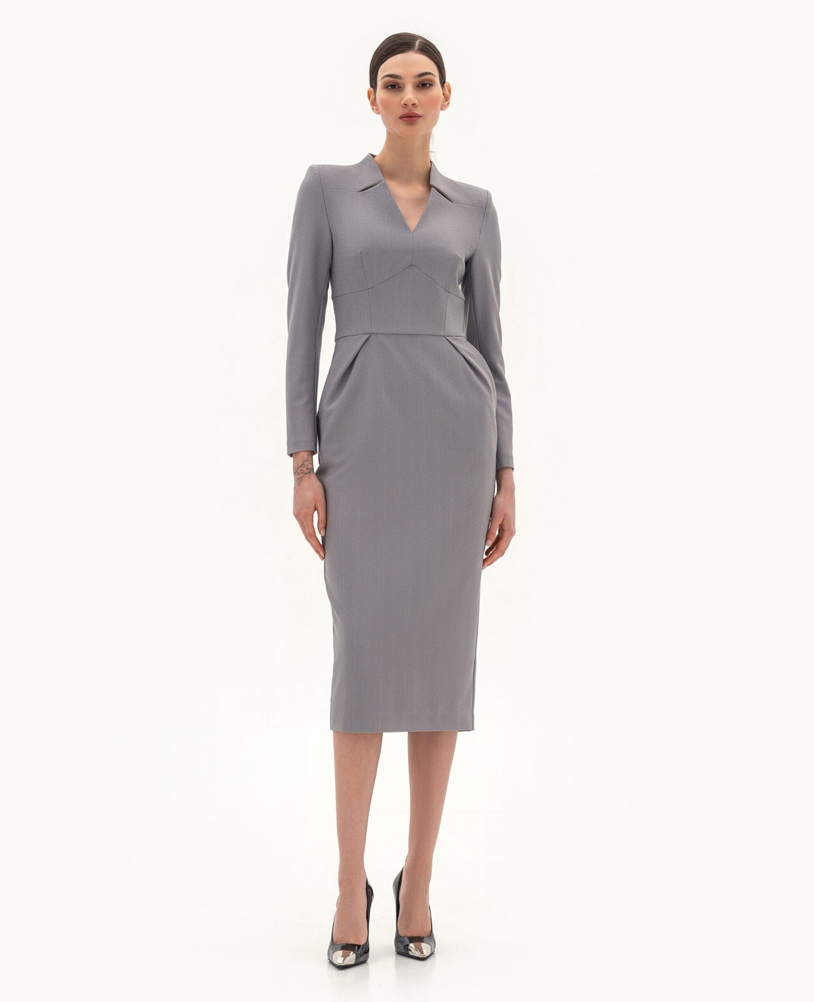 Вигляд виробу: пряма сукня з акцентними підрізами та рельєфами по лінії талії та вирізу горловини.