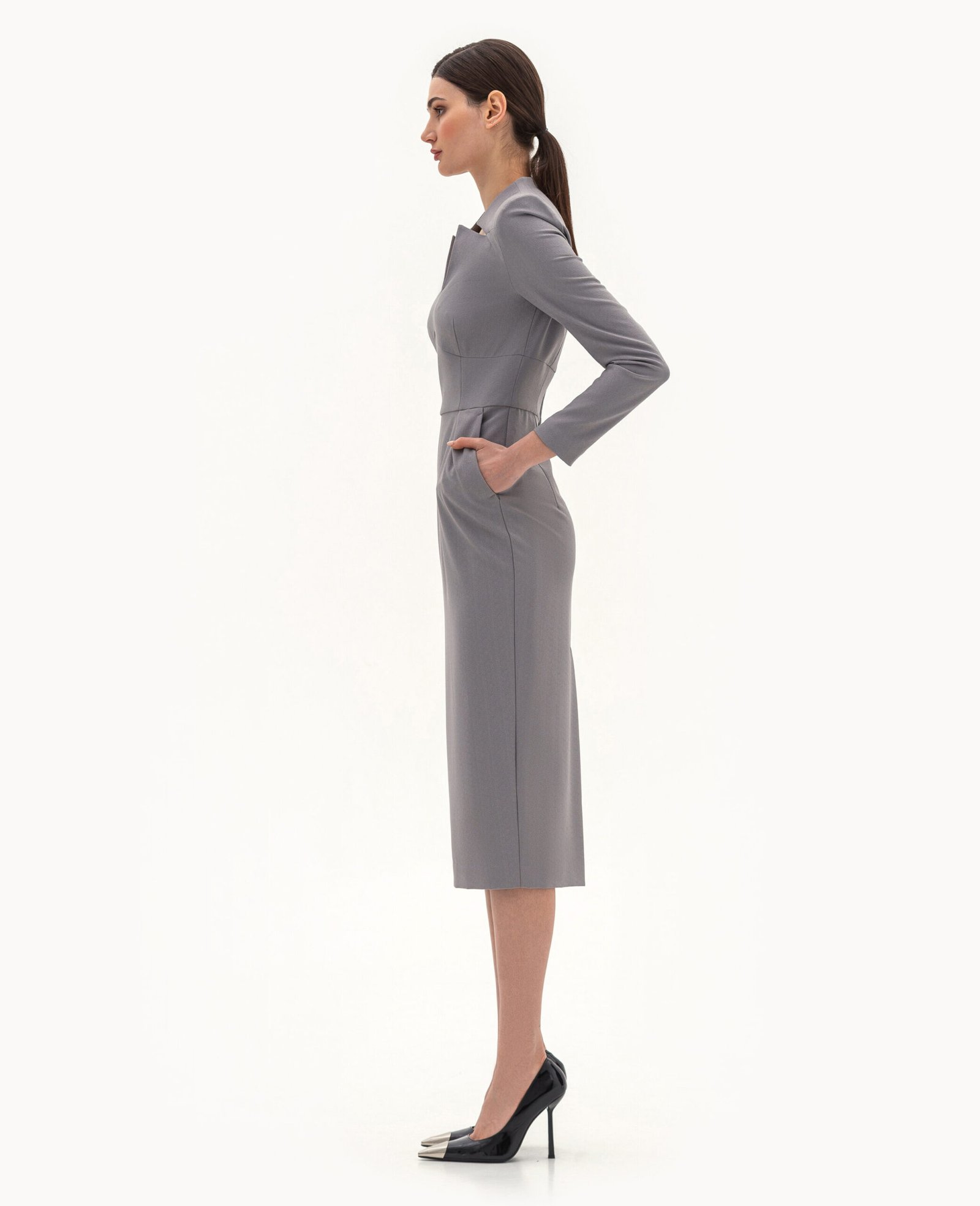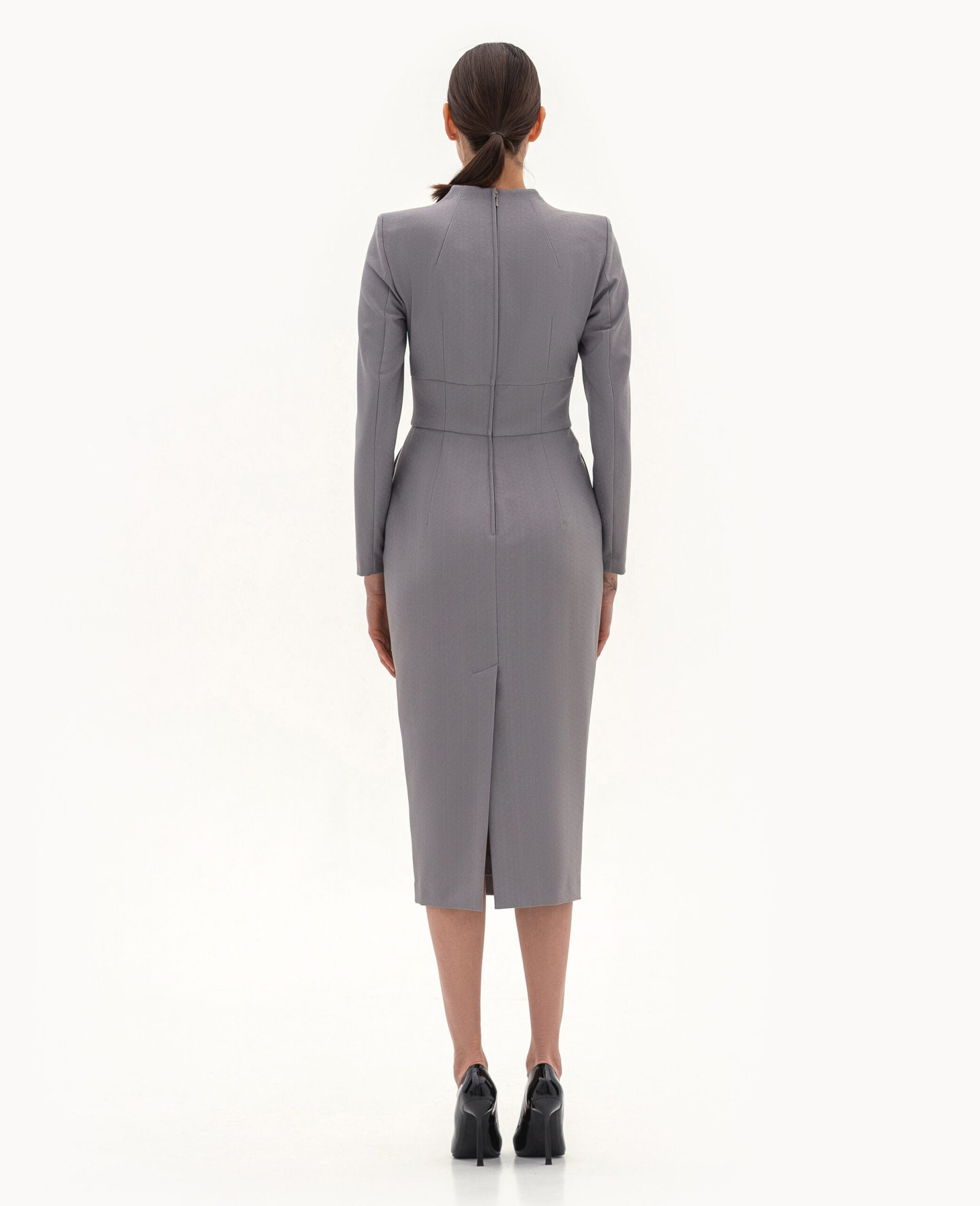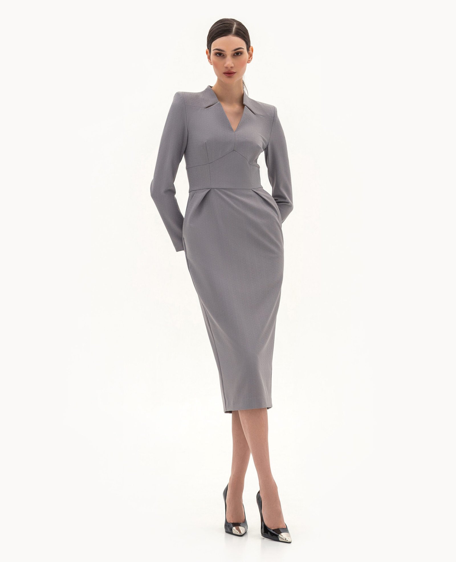 Вигляд виробу: пряма сукня з акцентними підрізами та рельєфами по лінії талії та вирізу горловини.
