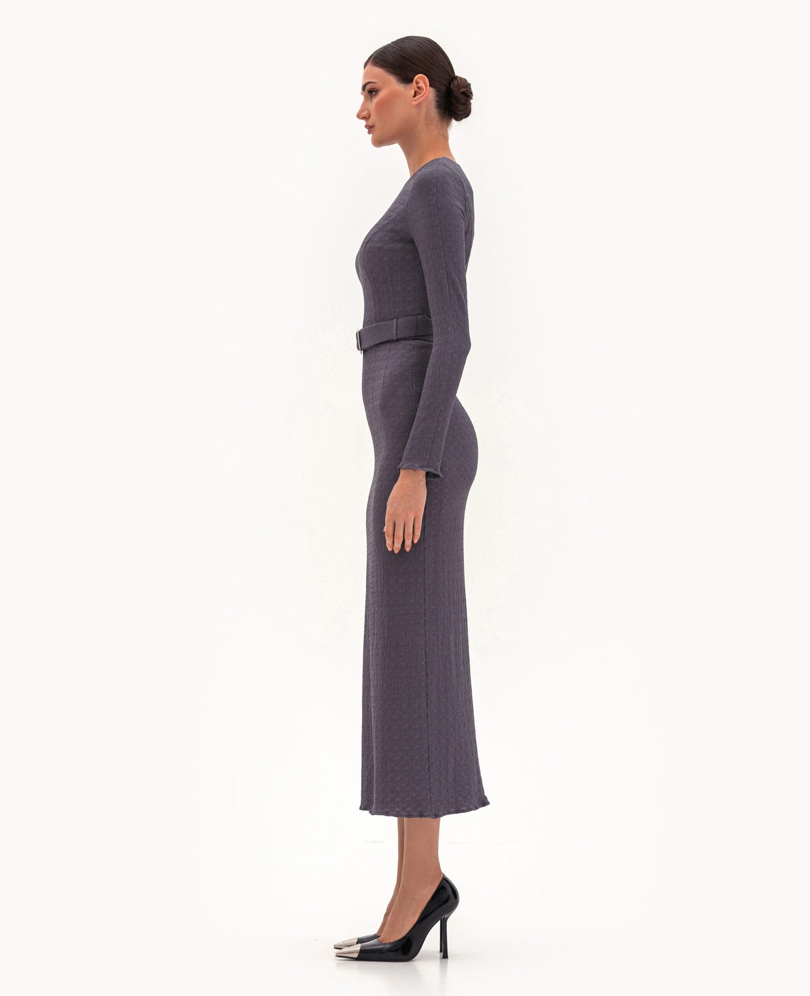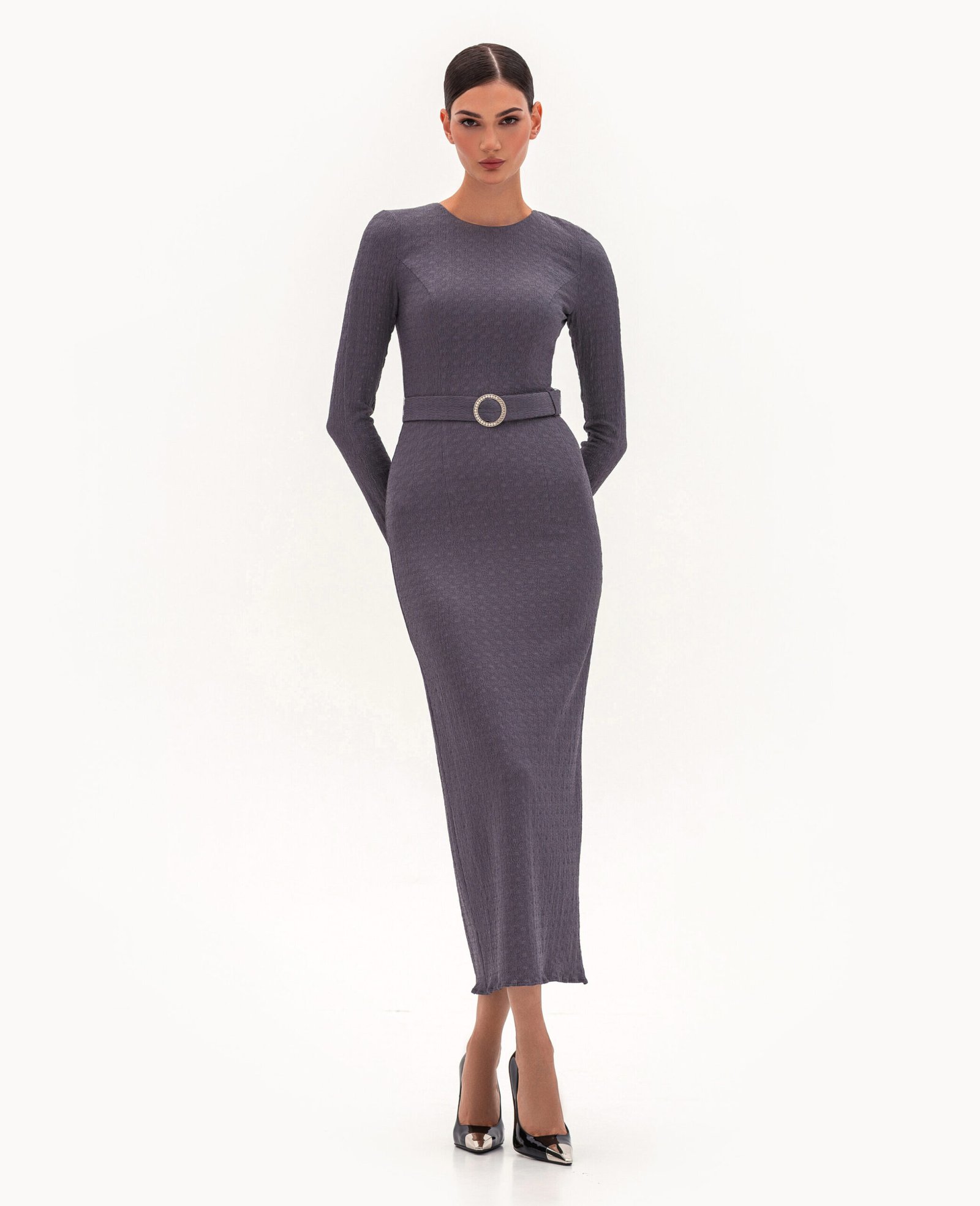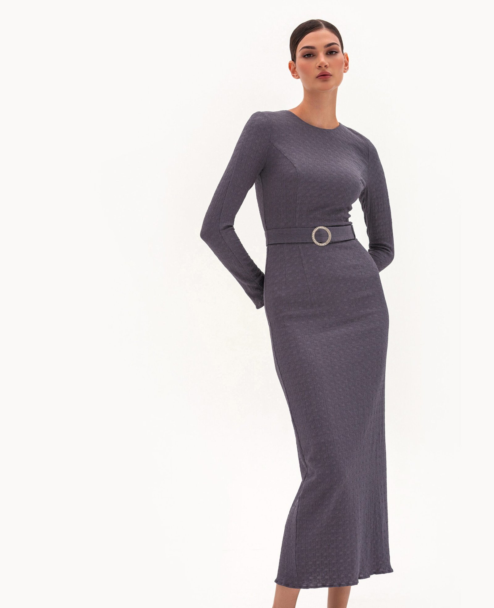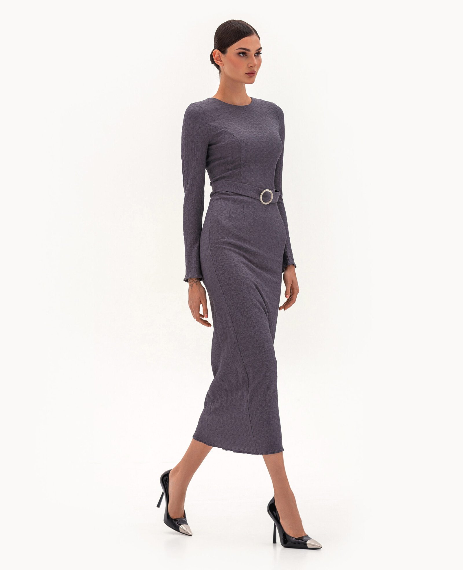 Вигляд виробу: пряма сукня-футляр у довжині мідл-максі, зі знімним поясом на декоративній пряжці.