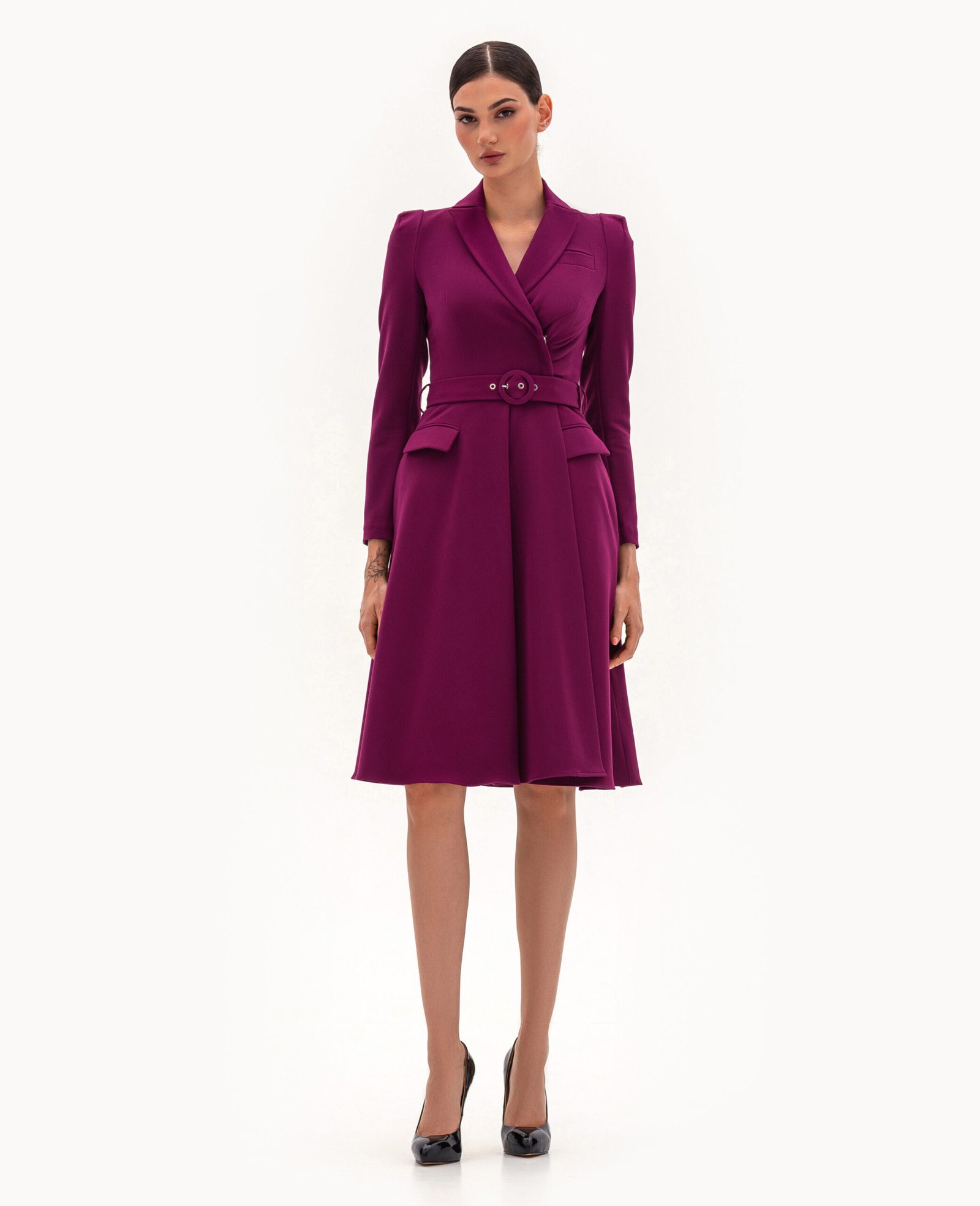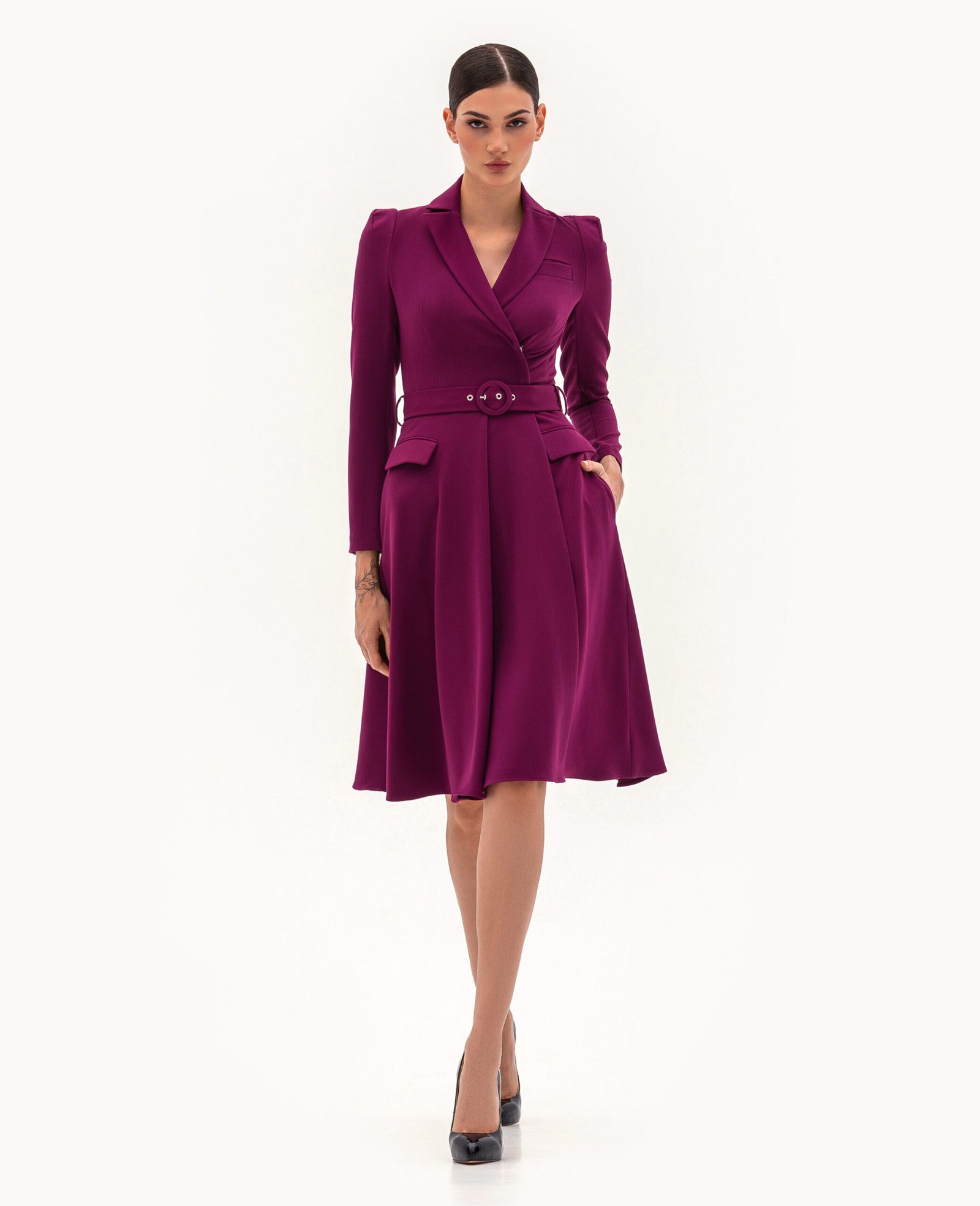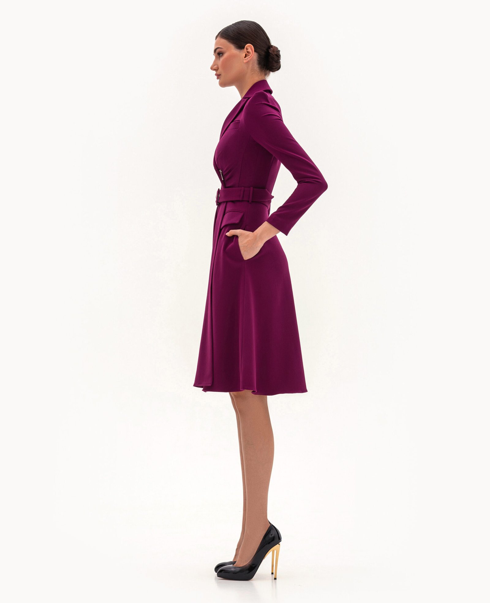 Вид виробу: сукня приталеного силуету під пояс, з спідницею, що розклешує на запах, коміром і лацканами, прорізними кишенями з клапаном і декоративним кантом золотого кольору.