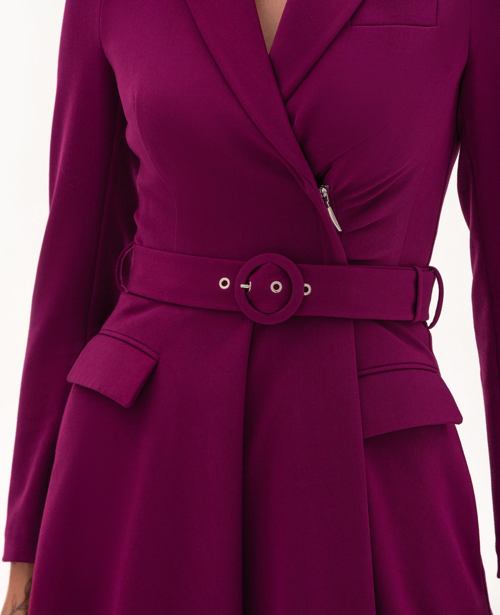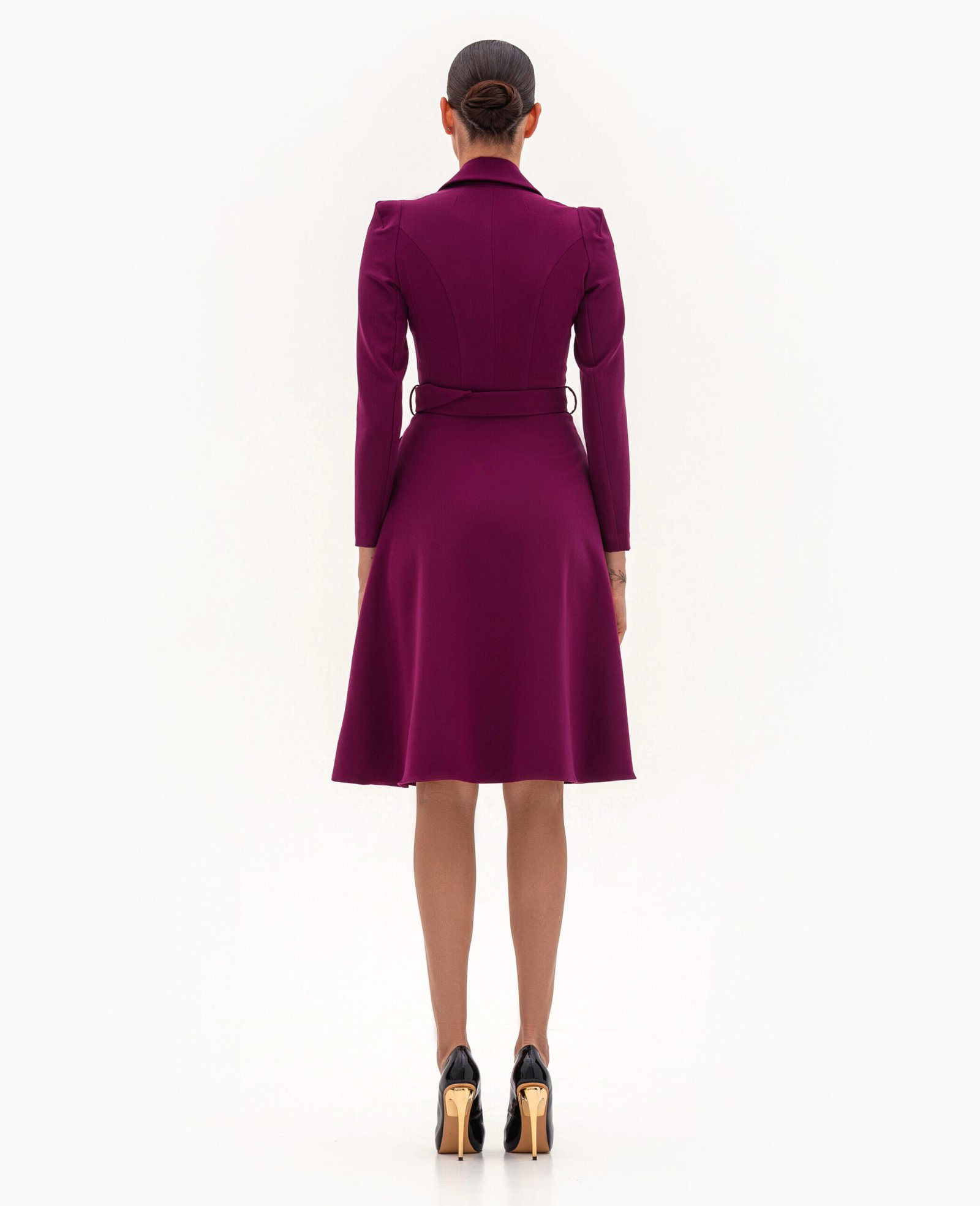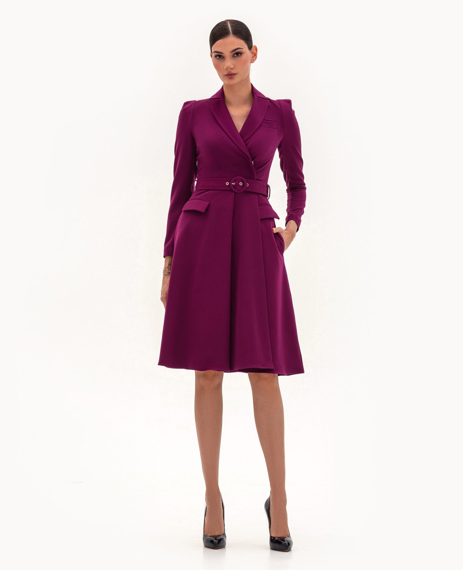 Вид виробу: сукня приталеного силуету під пояс, з спідницею, що розклешує на запах, коміром і лацканами, прорізними кишенями з клапаном і декоративним кантом золотого кольору.